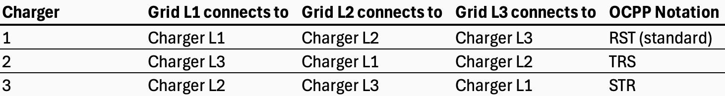 When a charger reports it’s drawing 32A on “L1”, the CPMS needs to know whether that’s actually Grid L1, L2, or L3. If the system assumes standard RST rotation when the charger is wired as TRS, all its phase balancing calculations will be wrong.