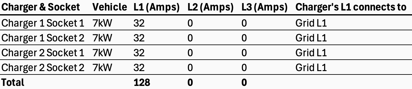 Result: 128A on L1 exceeds the 100A site limit. The L1 circuit breaker trips, or load management must aggressively curtail all charging (e.g. to 16A instead of 32A), even though L2 and L3 have zero load.
