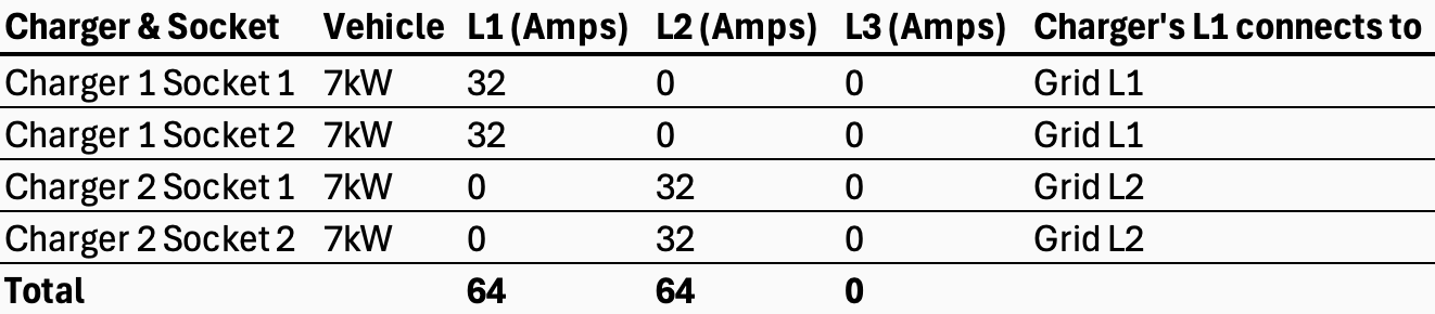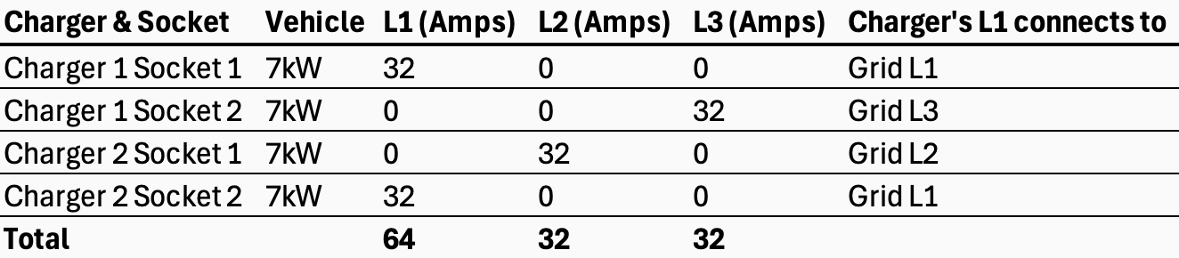 Now, when a single-phase vehicle connects to Charger 2 and draws from "L1" (from the charger's perspective), it's actually drawing from Grid L3. The load is spread across all three grid phases.