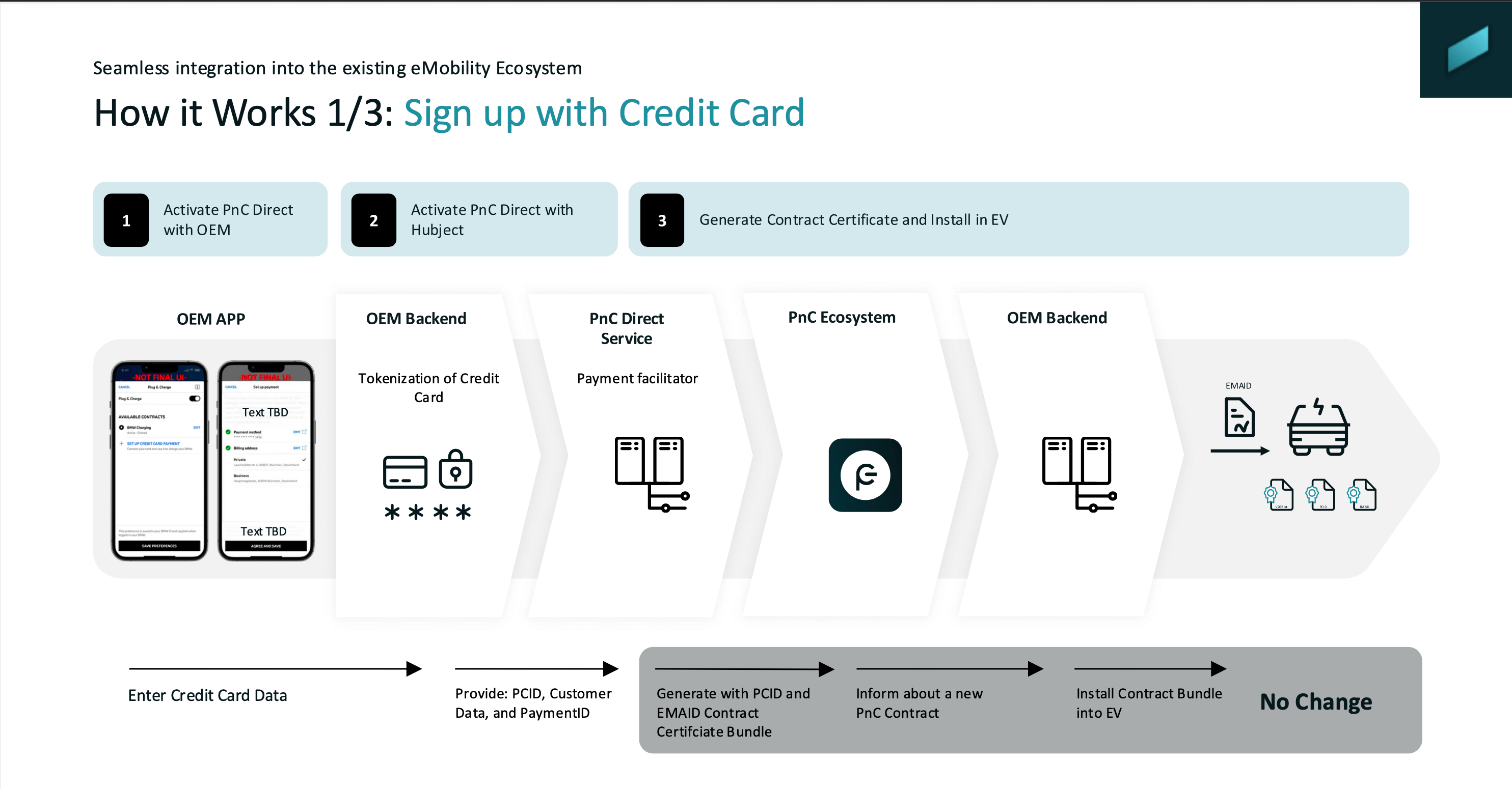 Plug & Charge Direct was introduced by Hubject and fundamentally expands the classic contract-based Plug & Charge model by adding direct payment via credit card, without breaking the ISO 15118 flow. In short: drivers no longer need a pre-existing MSP contract. Instead, they can register a credit card once via the OEM app or vehicle HMI, after which charging works exactly like Plug & Charge today – just plug in and charge. Behind the scenes, a contract certificate is still generated and installed in the vehicle, but it is now linked to a payment token rather than an MSP account, preserving the familiar PKI-based authentication model.