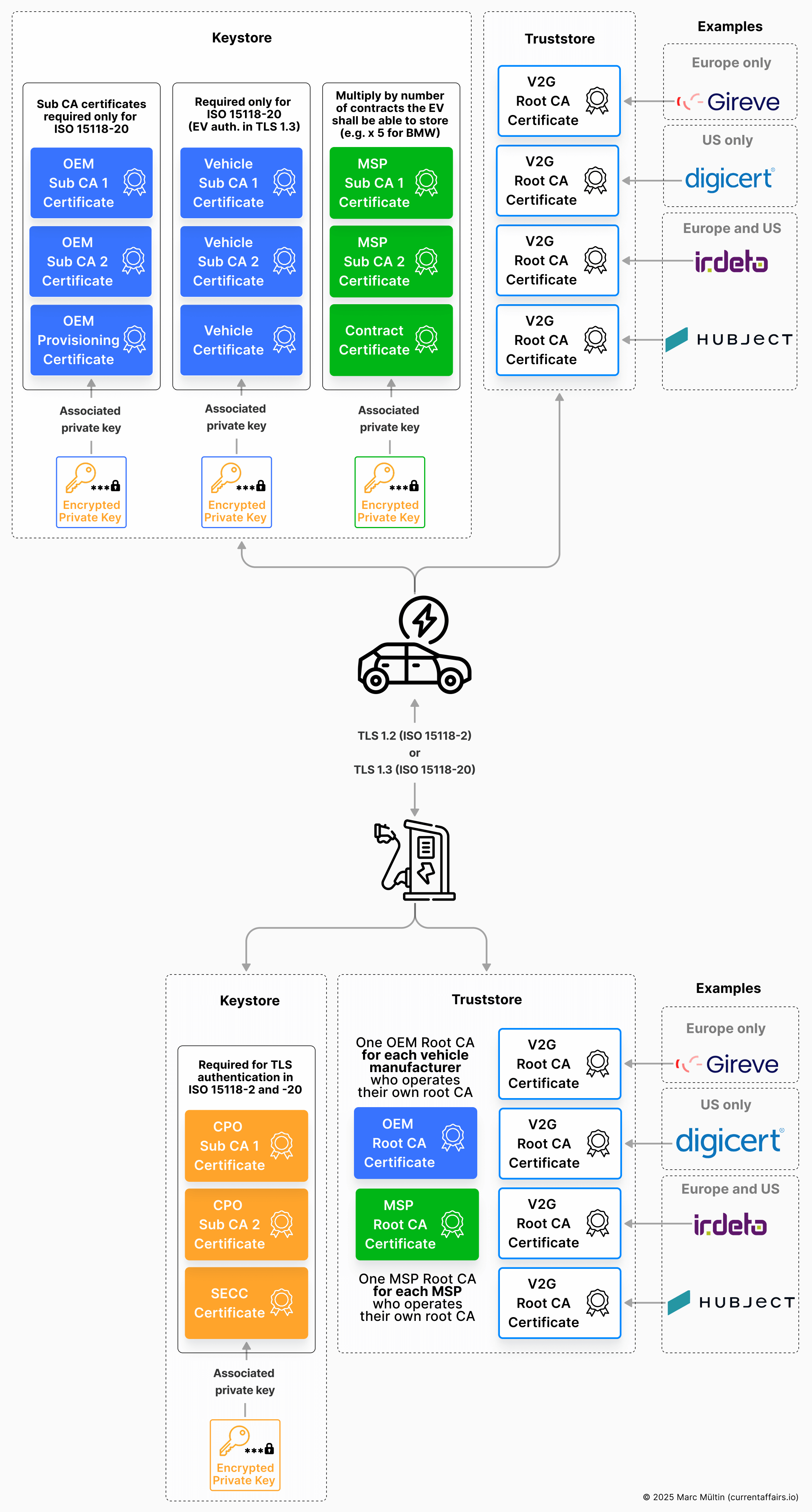 Let’s clarify what cryptographic material must live inside an EV and a charging station to establish a secure TLS 1.2 (ISO 15118-2) or TLS 1.3 (ISO 15118-20) connection and to provision, store, and validate the contract certificate(s) for Plug & Charge.