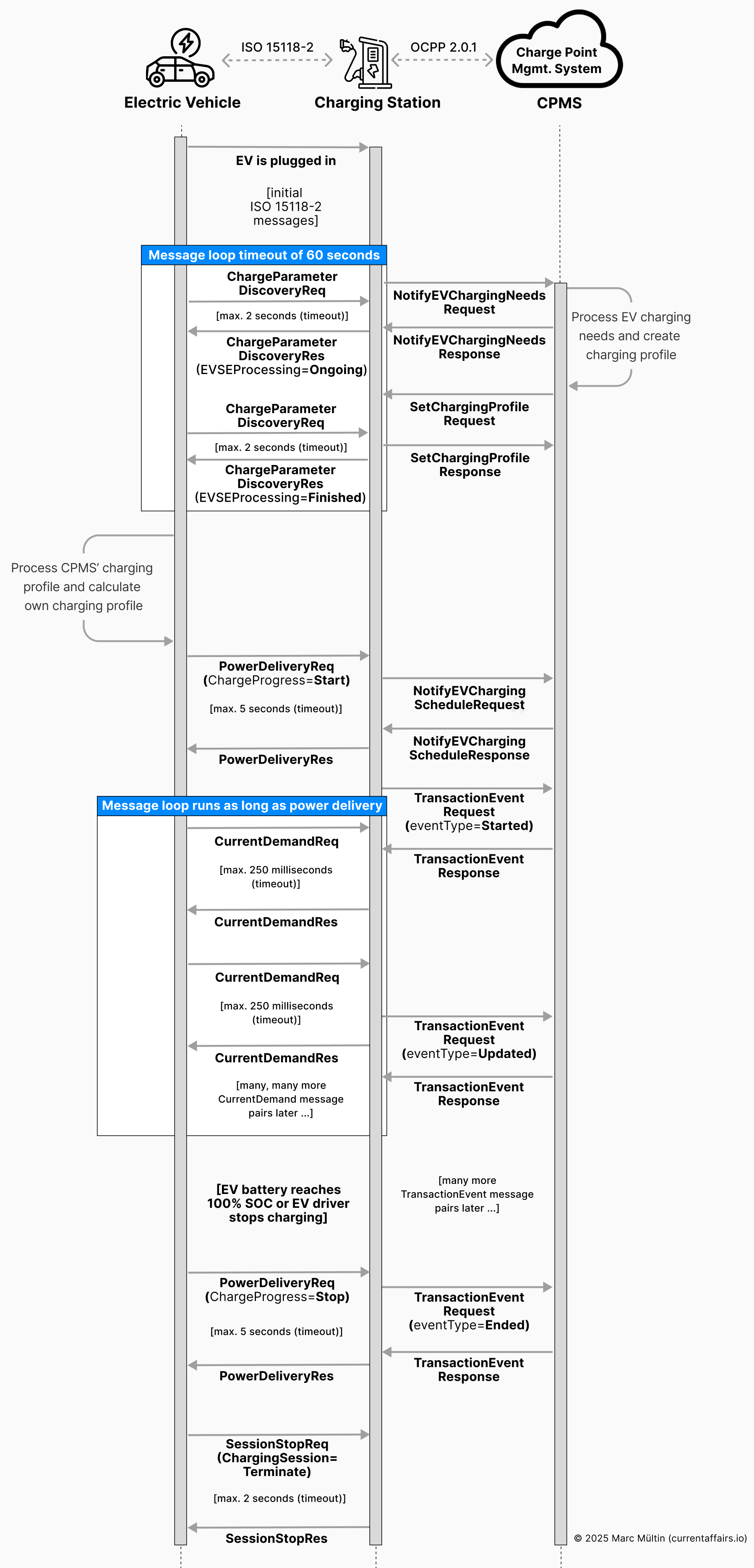 To tie everything together mentally (and visually), I’ve created a sequence diagram illustrating the ISO 15118-2 messages between the EV and charger and OCPP 2.0.1 messages between charger and cloud-based CPMS during a smart charging session. Note that I left any external charging limits (e.g. from an energy management system or DSO) or renegotiation of charge parameters out to keep the diagram cleaner.