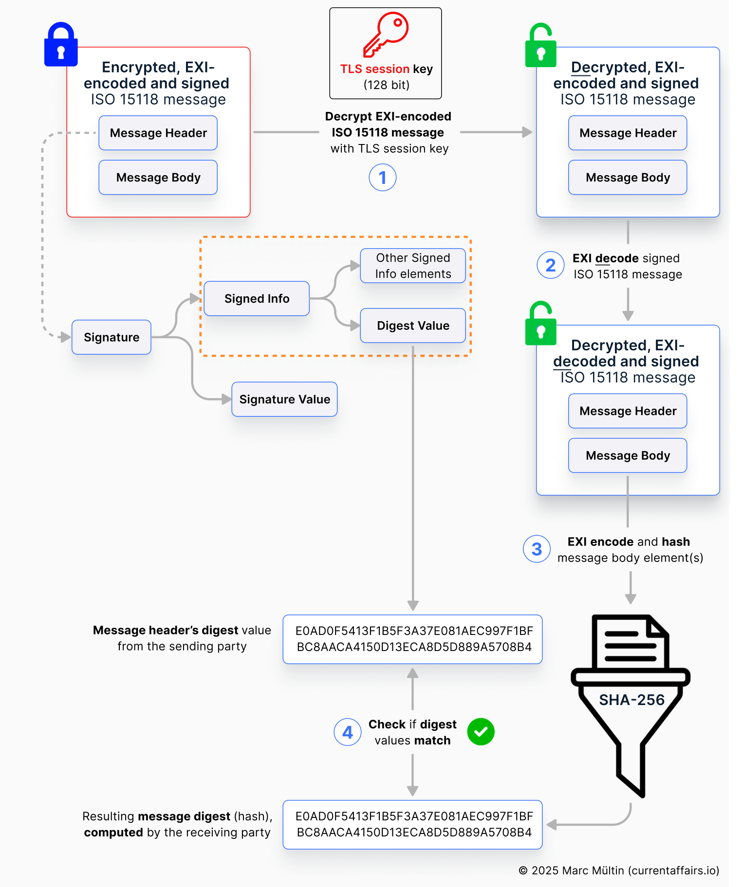 The same principle applies vice versa, of course, when the charger sends a digitally signed message to the EV.