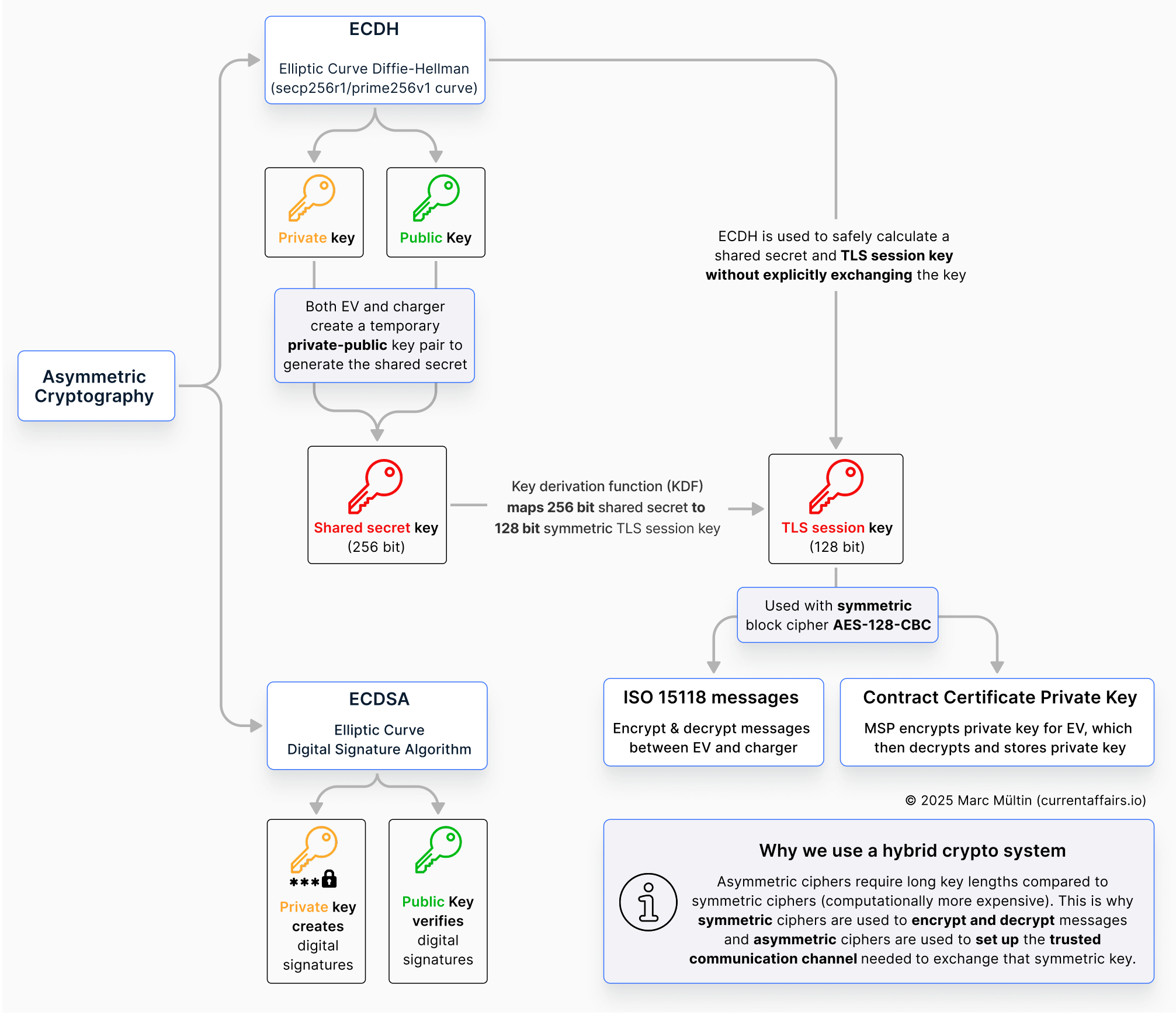 Key exchange algorithm: The big question is: how can the EV and the charger agree on a shared secret key (based off which the communication shall be encrypted) without anyone listening in, copying that key, and decrypting all their messages? That’s exactly what the Diffie–Hellman key agreement solves: it lets both sides start with their own private number (or digital private key), exchange only a derived public key, and then combine those keys in such a way that both end up with the same secret key, while an eavesdropper watching the exchange can’t reverse the math to uncover it.