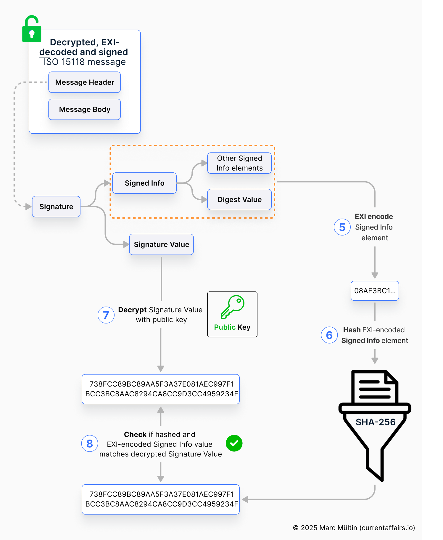 SignedInfois then also hashed using SHA-256, producing yet another hash value that represents theSignedInfodata field.Encrypt hashed and EXI-encoded SignedInfo: Using its private key, the EV will encrypt the hash value of the EXI-encoded