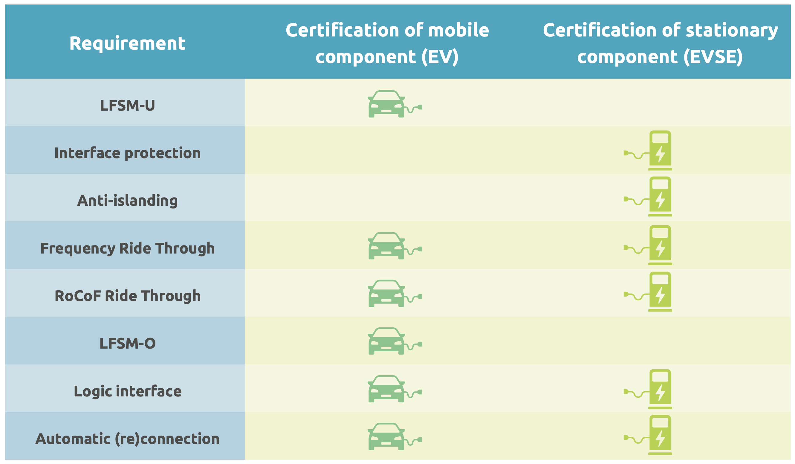 The EV must handle: LFSM-U (increasing active power output during under-frequency) and LFSM-O (reducing active power output during over-frequency). These are the inverter functions that restore grid stability — the EV’s contribution to active power control. Quick reminder: LFSM-U stands for Limited Frequency Sensitive Mode – Underfrequency, and the “-O” stands for Overfrequency.