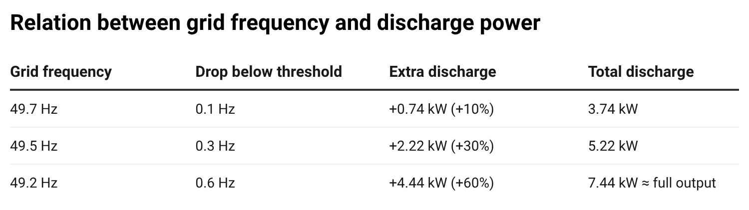 For every 0.1 Hz the frequency falls below the 49.8 Hz threshold, the unit increases its discharge by 10% of its rated power.