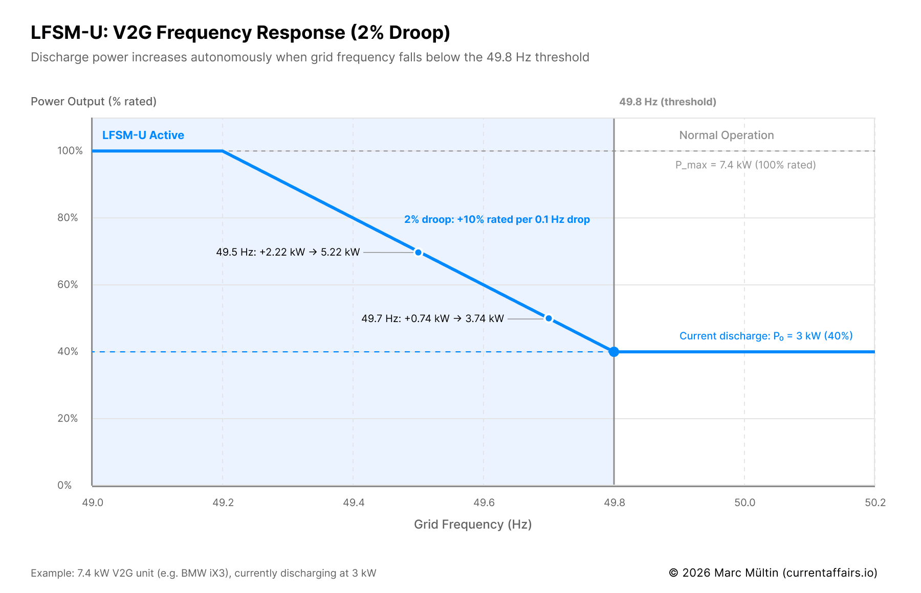 When frequency drops, a V2G unit must not just reduce consumption. It must increase discharge, i.e. act like a generator ramping up output to rescue the grid. The droop setting for this response is 2% — the value mandated by VDE 4105 and ElaadNL, and the tightest end of EN 50549-1’s 2–12% range.